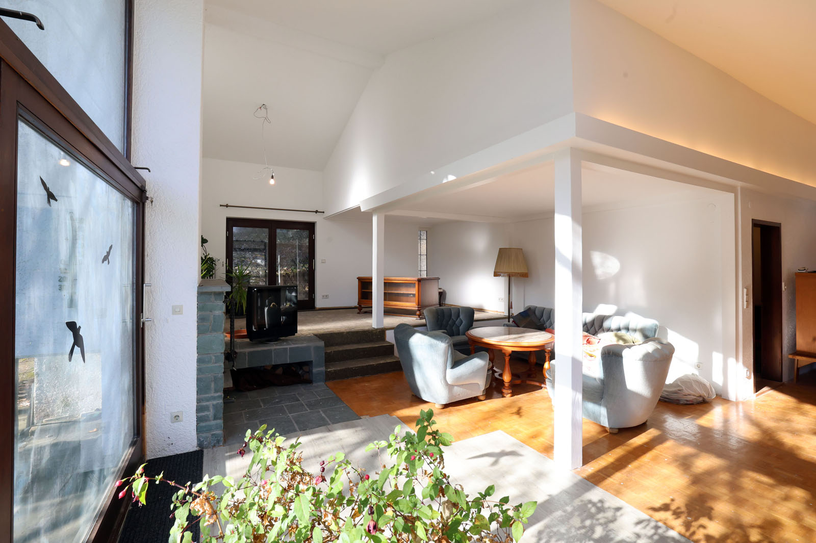 Erdgeschoss: Einladende Diele, geräumiger und heller Wohn/Essbereich mit Kamin und Ausgang auf den Balkon sowie die Terrasse, überdachtem Freisitz, Bad, separates WC, Schlafzimmer mit Ausgang auf den Balkon, Abstellraum.